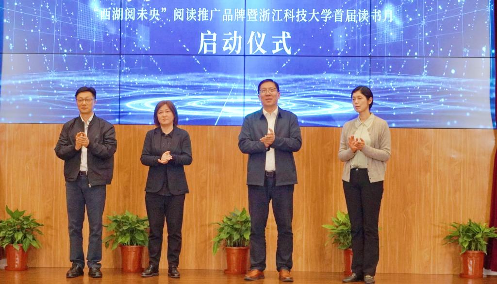启动仪式上,浙科大10位“阅读达人”、5名优秀志愿者,西湖区图书馆5名优秀志愿者和6个最美阅读空间受表彰。来自竞舟小学的肖誉萱同学朗诵《中国话》,我校留学生乌拉、安毅然等9位同学朗诵《诗词中的西湖》,“小Q悦读”4位同学朗诵《书香少年》。