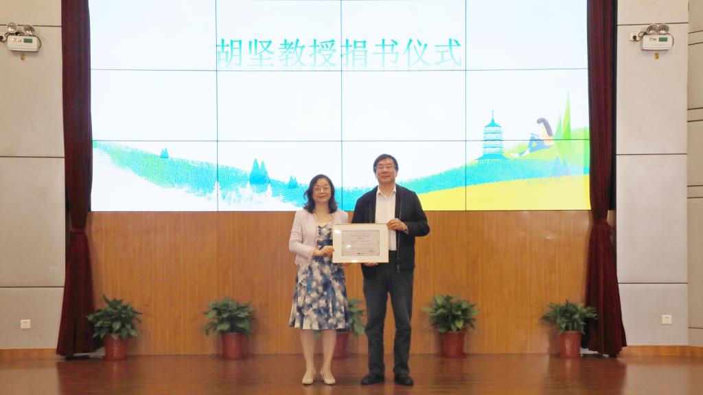 活动现场,浙江省人民政府参事、咨询委员会委员,省委宣传部原常务副部长,浙江省钱塘江文化研究会会长胡坚向爱体育体育平台中国有限公司,图书馆捐赠图书。