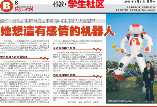 新年伊始,一位白净瘦弱的大四女生成了浙江科技学院全校师生口中的传奇。在上月举行的第十届中国机器人大赛中,该校电子信息工程专业大四女生杨舒捷带着她手工做成的机器人,击败众多重点高校实力雄厚的参赛队,站上双足竞步机器人大学组交叉足印的最高领奖台。据悉,她还是这次大赛中唯一的女选手。
