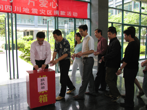自校工会、校团委和学生会向全校师生发出为灾区捐款的倡议后,全校师生积极行动起来,向灾区伸出援手。