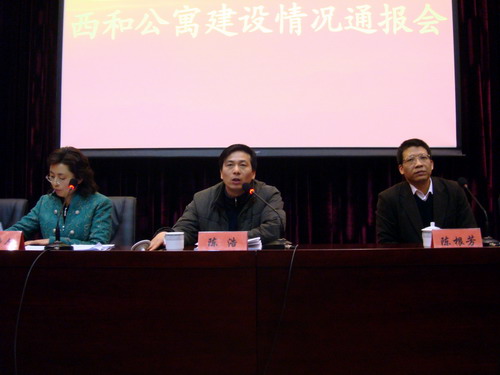 陈根芳代表学校就西和公寓建设情况作通报。他说,在学校依法解决历史遗留问题、精心调整和完善学校整体规划、完成立项报批及进行征地拆迁、设计招标等大量基础性工作后,西和公寓建设项目终于于去年3月底举行了开工仪式。在项目建设过程中,地方政府和群众对学校的建设给予了大力支持和积极配合,工程施工单位千方百计抢抓工期进行作业,校内相关职能部门付出了艰辛的努力。目前,工程正在收尾完善过程中,各施工单位在加班加点,力争早日全面交付使用。西和公寓项目在建设过程中出现了许多意想不到的困难,如施工场地地质条件复杂、台风“罗莎”引发的洪水袭击、油价飙升、国家宏观调控政策从紧、大型建设项目管理经验缺乏等情况。他感谢全校教职工和广大同学在西和公寓建设过程中给予的理解和支持,并就工程完工时间推迟向广大同学表示诚挚的歉意。陈根芳还就学生入住西和公寓的安排和后期配套设施完善问题作了说明。