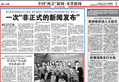 3月9日出版的浙江日报在三版头条以较大篇幅报道了我校学生对“两会”的关注。报道以《一次“非正式的新闻发布”》为题,对我校学生就大学生关注的“两会”相关热点问题连线正在北京参加会议的全国政协委员、校长杜卫这一次特殊的采访进行了报道。报道援引杜卫的话,称“大学生对‘两会’的关注超出我的想象”。