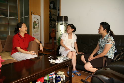 图4为校纪委书记、工会主席鲁凤(左)看望王青燕(中)老师